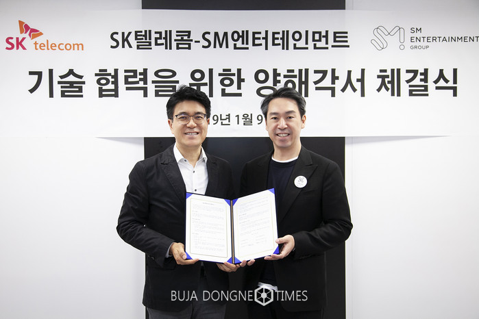 SK텔레콤은 9일(현지시각) 세계 최대 IT·가전 전시회 ‘CES 2019’가 열린 미국 라스베이거스에서 SK텔레콤 박진효 ICT기술센터장과 SM엔터테인먼트그룹 김영민 총괄사장이 만나 ‘기술 협력을 위한 양해각서(MOU)’를 체결했다고 밝혔다.
