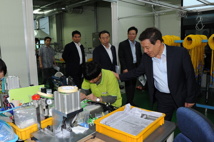 [광주=부자동네타임즈 손권일 기자] 윤장현 광주광역시장은 8월25일 오후 북구 첨단1단지에 위치한 광스플리터와 광어댑터 등을 생산하는 에프엔엔(주)(대표 주양진)를 방문해 생산시설을 둘러보고 근로자들을 격려하고 있다.