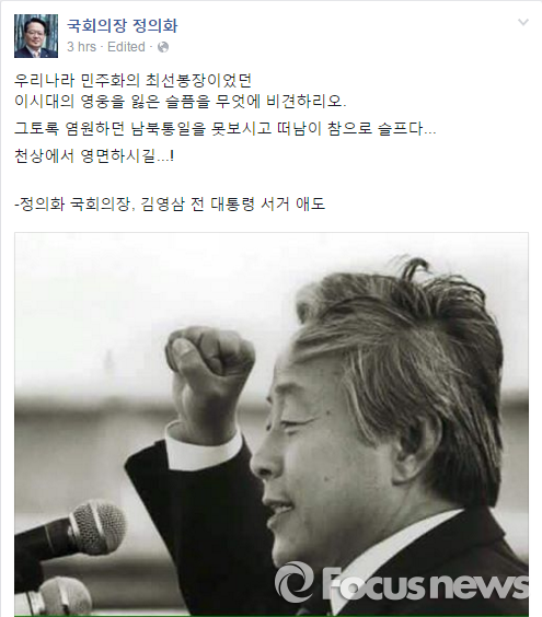 △ 정의화 국회의장이 페이스북에 김영삼 전 대통령의 서거에 애도를 표현하는 글과 사진을 올렸다. <사진출처=정의화 국회의장 페이스북> |