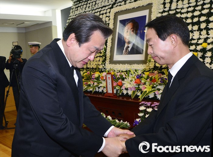 | △ 김무성 대표가 22일 서울 종로구 서울대병원 장례식장에 마련된 김영삼 전 대통령 빈소에서 조문한 뒤 김 전 대통령 차남 김현철씨와 슬퍼하고 있다. 2015.11.22 사진공동취재단 photo@focus.kr |
