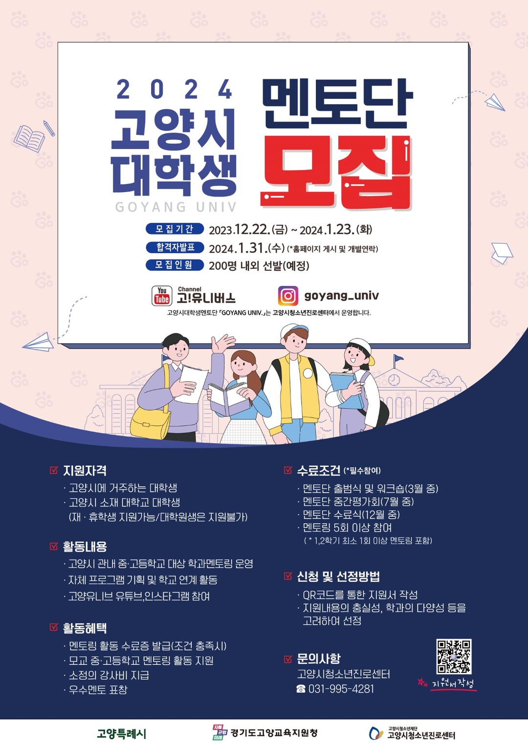 [부자동네타임즈 = 김인수 기자] 지난 2023년 12월 22일부터 2024년 1월 23일까지 고양시 중·고등학생의 학과 선택 및 진로 설계를 지원하는 고양시 대학생 멘토단 ‘고양유니브’를 모집한다.