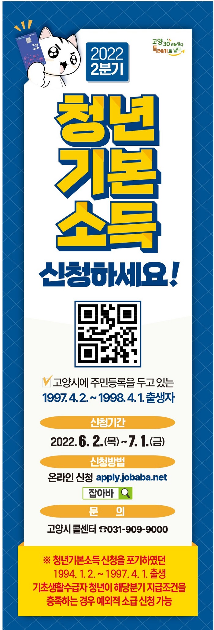 청년기본소득은 신청일 기준 고양시에 주민등록을 두고 경기도에 최근 3년 이상 계속 또는 합산 10년 이상 거주한 만 24세 청년에게 분기별 25만원(최대 4분기 지원)을 카드형 고양시 지역화폐(고양페이)로 지급하는 청년복지 정책이다.