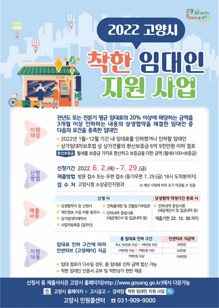 신청 모집 기간은 6월 2일부터 7월 29일까지로 신청 희망자는 고양시 소상공인지원과에 신청서, 상생협약서, 임대차계약서 사본, 임차인 사업자 등록증, 건물 등기부등본 등을 제출하면 된다. 신청 서류는 고양시청 홈페이지 고시‧공고 란에서 확인할 수 있다.