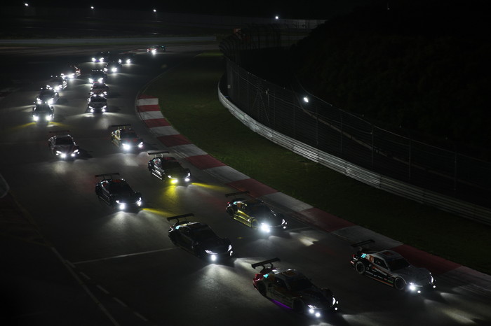 [사진설명] 2021년 나이트레이스에서 삼성화재 6000 클래스 레이스 차량들이 어둠속에서 질주하고 있다.