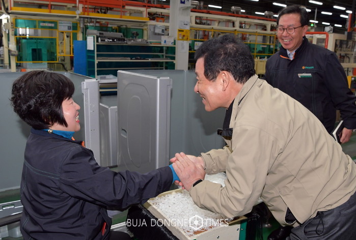 윤장현 광주광역시장이 산업현장의 목소리를 듣기 위해 23일 오후 광산구 하남산단 동부대우전자(주)를 방문, 기업관계자로부터 기업 현황을 듣고 생산현장을 둘러보며 근로자를 격려했다.