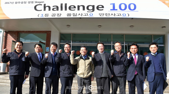 | △윤장현 광주시장이 산업현장의 목소리를 듣기 위해 광산구 하남산단 동부대우전자(주)를 방문, 기업관계자로부터 기업 현황을 듣고 기념촬영을 하고 있다 |
