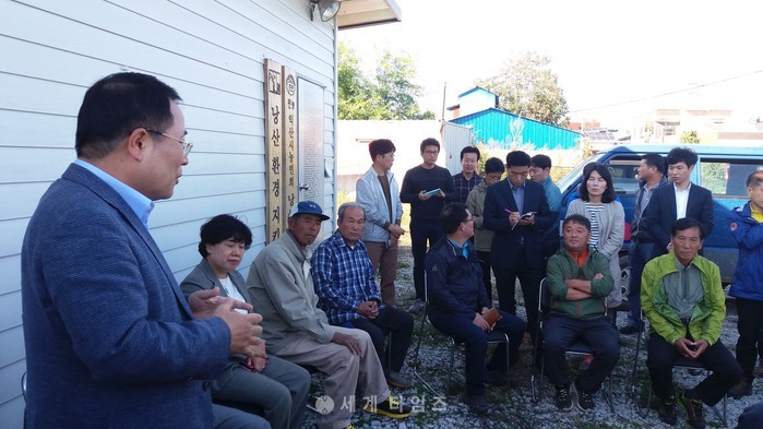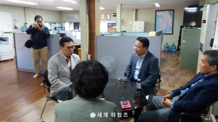 | ▲ © 부자동네타임즈 이상돈, 조배숙 국회의원, 정헌율 익산시장, 업체관계자가 대책을 논의하고 있다. |
