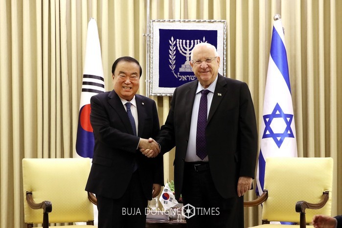 [부자동네타임즈 조영재 기자]이스라엘을 공식방문 중인 문희상 국회의장은 현지시간 12월 23일(일) 오전 11시 예루살렘에 위치한 대통령궁에서 루벤 리블린(Reuven Rivlin) 이스라엘대통령과 만났다.