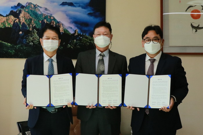 [사진설명] 김동빈 ㈜슈퍼레이스 대표(오른쪽)와 김만호 인제군 부군수(가운데), 김춘수 인제스피디움 대표가 기념촬영을 하고 있다.