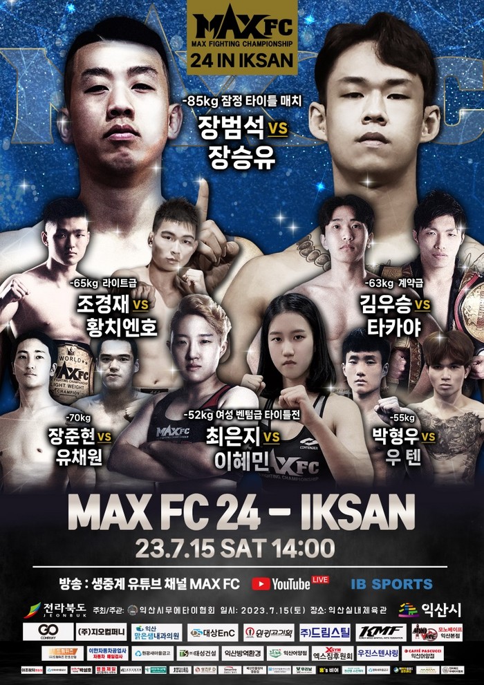 [부자동네타임즈 김인수기자] 국내 최대 입식격투기 단체 MAXFC(대표 이용복)가 오는 7월 15일(토) 익산실내체육관에서 열리는 ‘MAXFC 24 IN 익산’ 대회의 경기를 확정하고 포스터를 공개하면서 대회의 본격적인 홍보에 들어갔다.