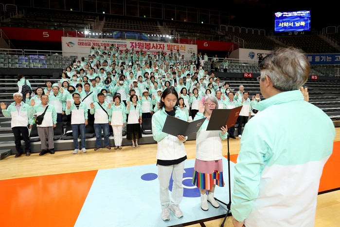 이날 자원봉사자들은 책임감과 자부심을 가지고 임할 것을 선서하고 생활체육대축전의 성공적인 개최를 기원하는 퍼포먼스를 진행했다.