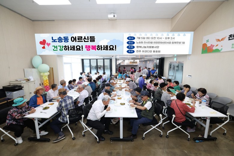 [전주시=세계타임즈 = 이영임 기자] 행복나눔자원봉사단(단장 홍미연)이 지난 5일 오전 10시부터 오후 2시까지 전주시 노송동 천사마을 희망문화센터 4층에서 ‘어르신들 건강하세요! 행복하세요’라는 주제로 특별한 시간을 가졌다.이날 행사에는 봉사단 대표를 포함한 봉사자들과 노송 노인정 어르신 외 노송동 주변 어르신 87명을 모시고 진행됐다.