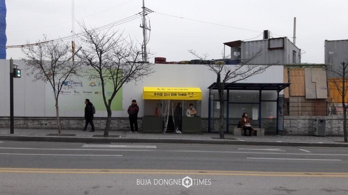 또, 온(溫)두막은 노란색상 지붕에 ‘추위를 잠시 피해가세요’란 문구를 새겨 눈에 잘 띄도록 했으며, 4면을 투명비닐로 제작해 천막 안에서도 정류장의 운행정보시스템과 버스가 오는 걸 확인 수 있다.