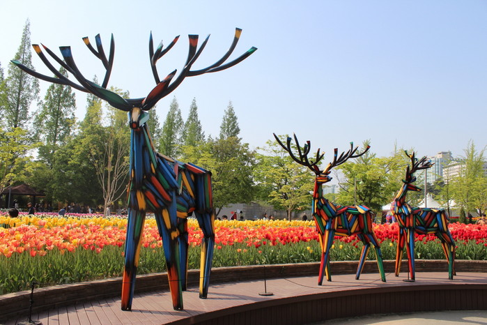 튤립정원 옆에는 눈길을 사로잡는 사슴과 강아지 조형물이 있다. 김우진 조형작가의 ‘사슴’, ‘강아지’ 작품이다. 작가는 어릴 적 동화책에서 본 동물을 좋아해 사육사를 꿈꿨다고 한다. 알록달록한 색채의 세 마리 사슴 조형물은 살아 있는 듯 튤립정원을 산책하는 것 같다. 야생의 평원을 거닐 듯 평화로운 모습이다. 친근하고 포근하게 생긴, 덩치 큰 강아지도 든든하게 꽃박람회장을 지켜준다.