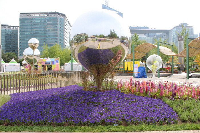주제광장 ‘모멘텀 가든’은 수많은 거울로 이루어져 현실과 환상을 넘나드는 감각적인 공간이다. 현실의 모습이 반사되고 복제되어 또 다른 차원으로 빨려 들어가는 듯 착각에 빠지게 된다. 낮고 넓은 원형의 유리 구조물은 외계로 향하는 우주선 같기도 하다. 볼록한 은색 열기구는 꽃밭 위로 서서히 떠오를 것 같아 왜곡된 모습을 보는 재미를 느낄 수 있다.