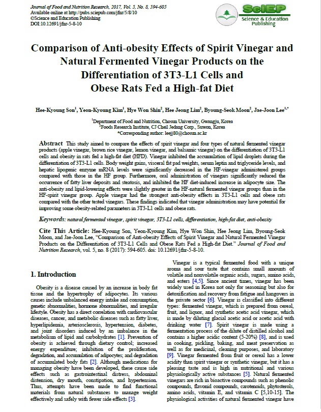 그동안 식초의 기능성 연구와 항비만 효과를 확인하는 연구는 학계 및 업계에서 꾸준히 진행되어 왔으나, 이번 연구는 소비자들이 실제로 마트에서 구입하는 자연발효식초 제품으로 진행됐다는 점에서 의미가 있다. 이 연구는 CJ제일제당이 조선대학교 식품영양학과 이재준 교수팀과 공동으로 진행했다.