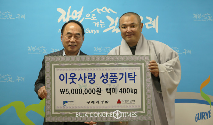 [부자동네타임즈 손권일 기자]구례군은 지난 11월 30일 구례 사성암(주지 대진 스님)에서 성금 500만 원과 쌀(20kg) 20포를 기탁하였다고 밝혔다.