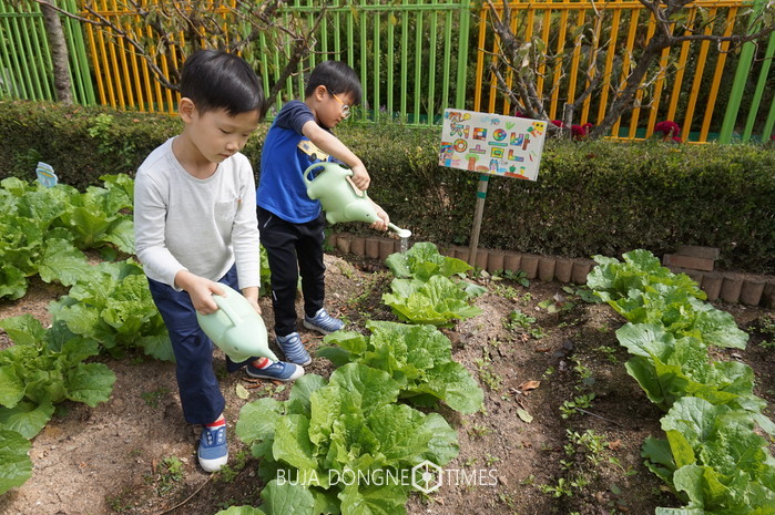 | △유아들이 지난 늦여름 유치원 텃밭에 심었던 가을 배추 모종 120여 포기에 물을 주고 가꾸어 무공해로 자란 배추를 수확하고 다듬어 씻고, 소금으로 절인 배추로 김치를 담그는 전 과정에 유아와 교사가 함께 참여했다 |