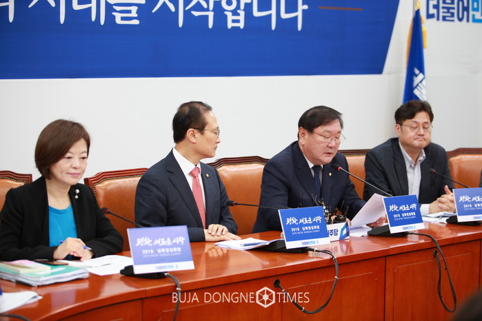 홍영표 원내대표 제가 가장 중요한 것을 빼먹었다. 저도 원내대표 된 지 며칠 안 되다 보니까 우왕좌왕한다. 저희 원내대표단을 선임해서 사실상 원내대표단 구성을 1단계로 완료했다. 그래서 지난번에 소개해 드리지 않은 부대표 분들이 오늘 처음 참석하셨기 때문에 제가 언론인들에게 소개드리고, 인사말씀 한 마디씩 하도록 하겠다. 제가 먼저 소개드리고, 나중에 한 말씀씩 하시기 바란다. 권미혁 부대표, 금태섭 부대표, 권칠승 부대표, 어기구 부대표, 김병욱 부대표다. 황희 부대표다.