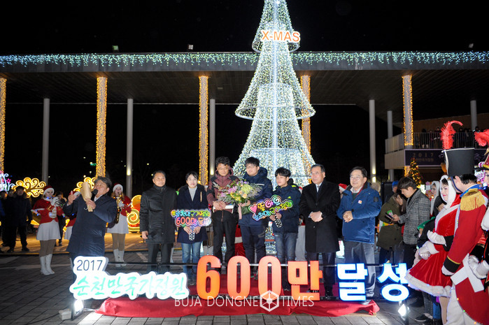 이날 순천만국가정원은 관람객 600만명 입장을 기념하기 위해 레이저 쇼와 트론댄스, 불꽃놀이로 뜨거운 크리스마스 저녁을 만들었다. 영광의 600만번째 관람객으로 입장한 양종섭씨(광주광역시, 45세)는 “순천만국가정원을 밝힌 불빛들과 화려한 퍼레이드까지 넘치는 볼거리로 추위를 이겨보려 축제를 찾았는데, 크리스마스에 이런 행운까지 얻게 되어 산타에게 선물을 받은 기분이다. 매우 기쁘고 감사드린다”며 따뜻한 봄이 오고 꽃이 피게 되면 꼭 다시 찾겠다고 소감을 전했다.
