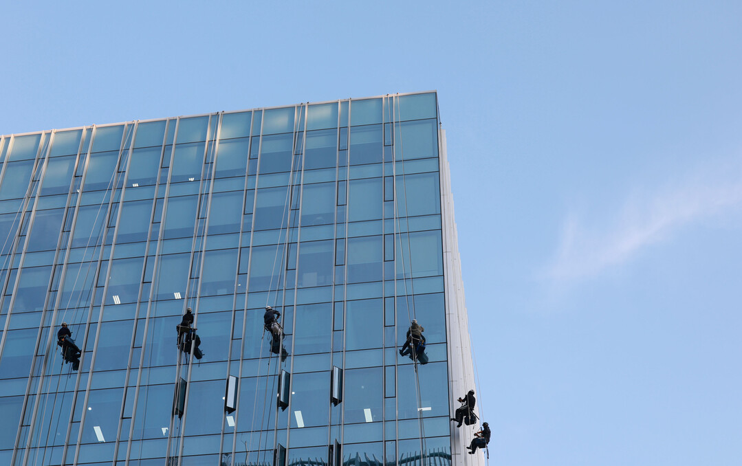 [부자동네타임즈 = 이언금 기자] 16일 서울 종로구의 한 빌딩에서 관계자들이 외벽 물청소를 하고 있다. 2025.4.16