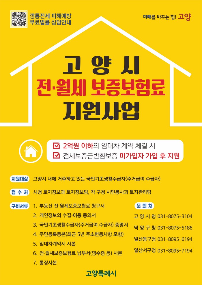 이에 따라 고양특례시(시장 이동환)은 올해부터 저소득 주민을 대상으로 전세보증금반환 보험료를 지원하는 사업을 실시한다고 밝혔다.