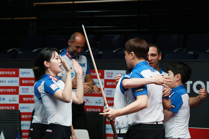 [사진설명] PBA 팀리그 휴온스 프로당구팀 승리를 환호하고 있다.