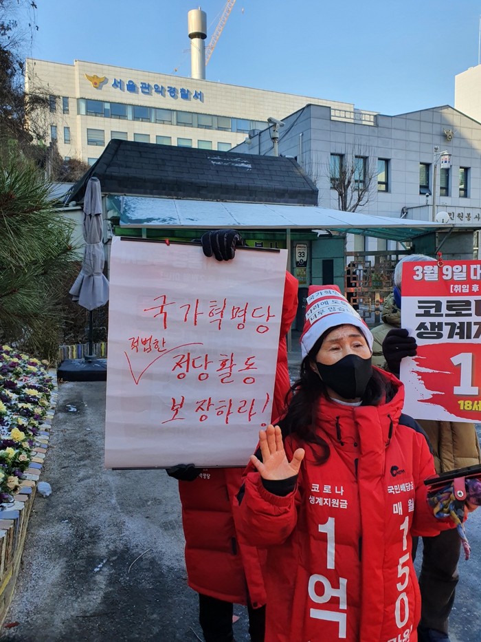 중앙선관위 관악청사 정문 앞에서 ‘불공정 여론조사를 시정하고 공정한 선거운동을 보장하라!’고 촉구하는 허경영 국가혁명당 지지자 박경하씨 등 4명 중 2명이 경찰에 1월 17일 체포되는 초유의 사테에 대해 선관위는 책임을 통감해야 한다.