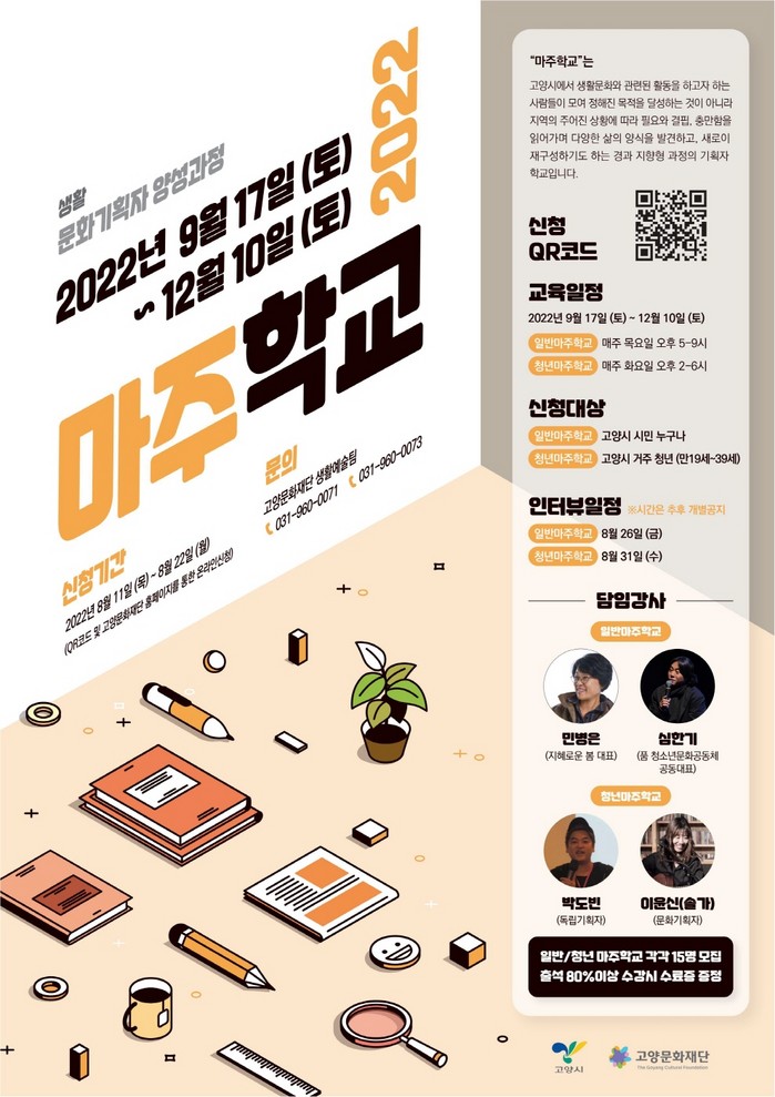 [부자동네타임즈 김인수기자] 고양특례시(시장 이동환) 산하 고양문화재단(대표이사 정재왈) 생활문화센터는 오는 8월 11일부터 22일까지 2022 문화기획자 양성아카데미 마주학교 참여자를 모집한다.