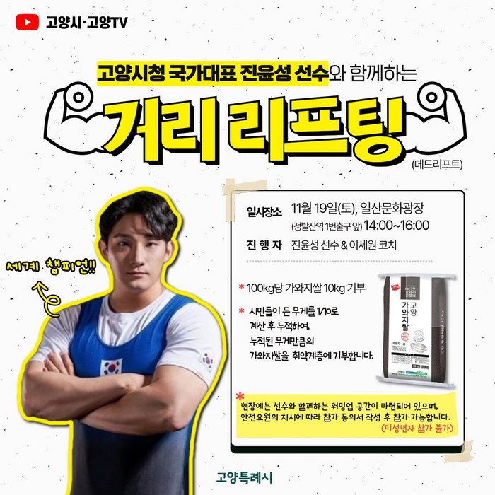 이번 행사는 시민이 바벨을 들면, 든 무게의 10kg당 1kg의 가와지쌀을 취약계층에 기부하는 방식으로 진행된다. 본격적인 겨울철을 앞두고 지역의 어려운 이웃들에게 따뜻한 나눔을 전하려는 취지에서 기획됐다.