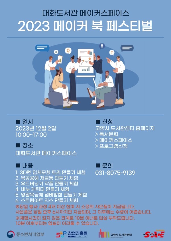 [부자동네타임즈 = 김인수 기자] 도서관센터가 ‘실생활에 필요한 창조 혁신 인재(메이커) 체험’을 주제로 오는 12월 2일 대화도서관에서 ‘2023 대화도서관 메이커 북 페스티벌’을 개최한다.
