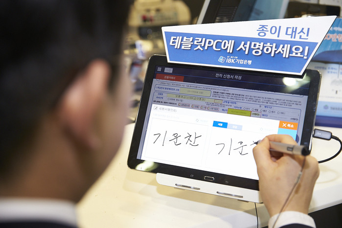 기업은행은 창구업무 100% 디지털화를 목표로 연내에 기업고객 전창구에 태블릿PC를 설치해 전자문서 시스템을 적용할 계획이다.