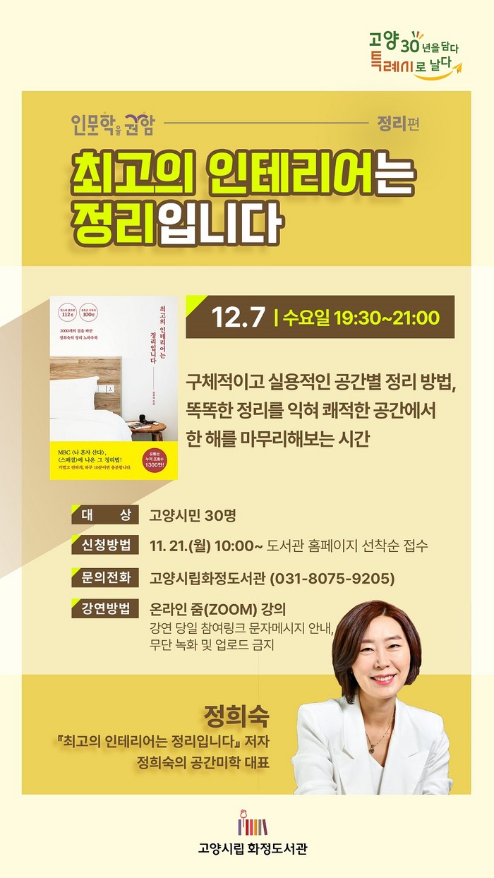 [부자동네타임즈 김인수기자] 고양특례시(시장 이동환) 화정도서관이 오는 11~12월 연중 테마강좌인 ‘인문학을 권함: 정리편’을 진행한다. 이번 테마강좌에서는 하루 15분 정리의 힘의 저자 윤선현 작가, 최고의 인테리어는 정리입니다의 저자 정희숙 작가가 강연을 펼친다.