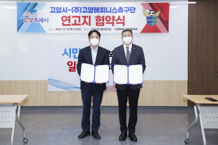 [부자동네타임즈 김인수기자] 고양특례시(시장 이동환)가 지난 15일 고양시청 평화누리실에서 ㈜고양해피니스(구단명: 고양해피니스축구단)와 2023년 K4리그 참가를 위한 연고지 협약을 체결했다.