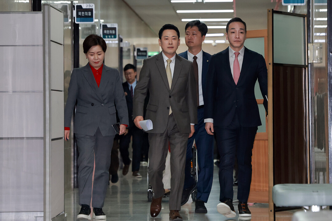 [부자동네타임즈 = 조영재 기자] 국민의힘 장동혁 대표가 19일 국회에서 열린 최고위원회의에 참석하기 위해 최고위원들과 회의실로 향하고 있다. 2026.3.19
