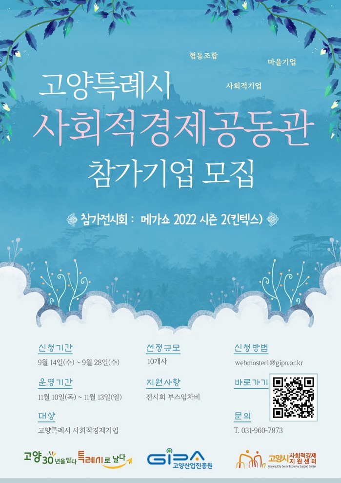 [부자동네타임즈 김인수기자] 고양특례시(시장 이동환)와 고양산업진흥원(원장 오창희) 고양시사회적경제지원센터(이하 지원센터)는 관내 사회적경제기업을 대상으로 ’고양시 사회적경제공동관‘ 참가기업을 9월 28일까지 모집한다.