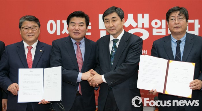 | △ 여야 원내지도부가 2일 오전 서울 여의도 국회에서 열린 예산안 및 법안 처리 관련 회담을 마친 뒤 합의문을 들고 취재진을 향해 포즈를 취하고 있다. 왼쪽부터 조원진 새누리당 원내수석부대표, 원유철 원내대표, 이종걸 새정치민주연합 원내대표, 이춘석 원내수석부대표. <사진제공=포커스뉴스> |