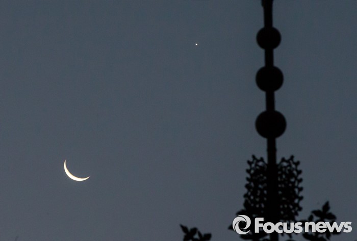 (서울=포커스뉴스) 8일 오전 서울 종로구 조계사 8각10층 진신 사리 석탑 위로 그믐달과 금성(샛별)이 밝게 빛나고 있다.