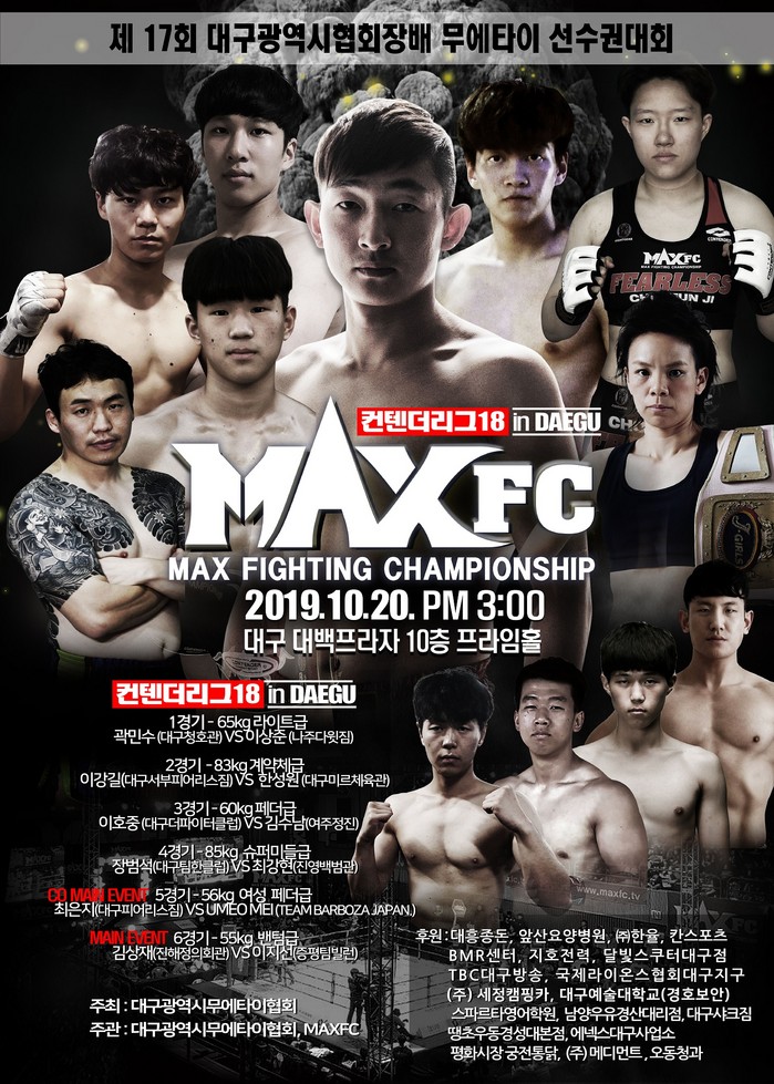 [부자동네타임즈 김인수기자] MAX FC는 10월 20일 대구 대백프라자 10층 프라임홀에서 열리는 'MAX FC 컨텐더리그 18'의 모든 대진을 확정하고 포스터를 공개했다.