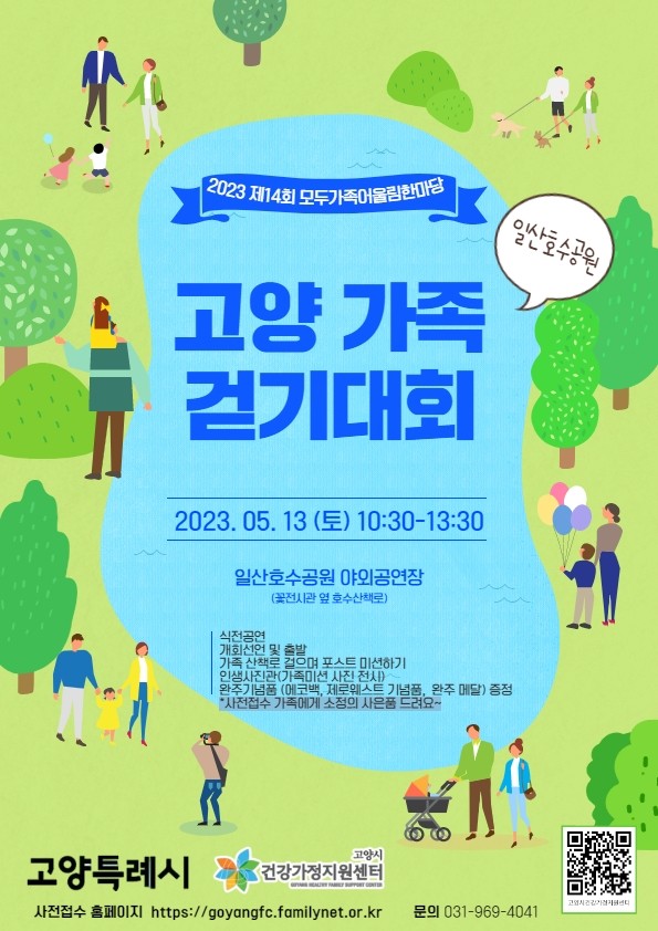 [부자동네타임즈 김인수기자] 고양시건강가정지원센터에서 가정의 달 기념행사로 오는 5월 13일(토) 10시 30분부터 일산호수공원 야외공연장에서 ‘제14회 모두가족어울림한마당 고양 가족 걷기 대회’ 행사를 개최한다.