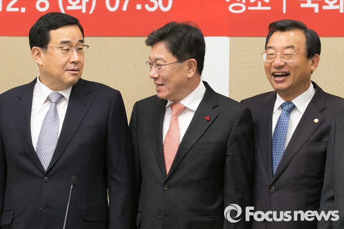 | △ 윤상직(가운데) 산업통상자원부 장관과 김정훈(왼쪽) 새누리당 정책위의장, 이정현 최고위원이 8일 오전 서울 여의도 국회에서 열린 '민생안정! 에너지 지원대책' 당정협의에 참석해 기념사진을 찍고 있다. <사진제공=포커스뉴스> |