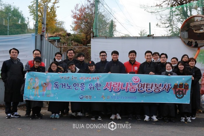 [부자동네타임즈 김현정 기자]생활뷰티기업애경산업(대표이사고광현)은다가오는연말을맞아자칫관심밖으로밀릴수있는지역사회저소득취약계층을위한 ‘사랑의연탄나눔봉사활동’을펼쳤다.