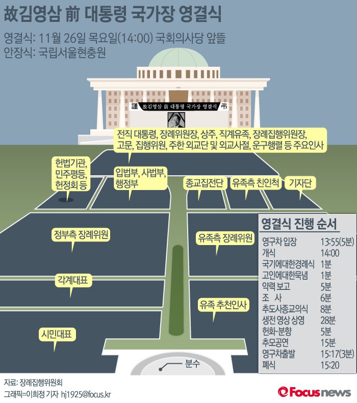 한편 국회에서 거행되는 김 전 대통령 영결식에는 유족과 친지, 장례위원회 의원, 국가 주요 인사, 각계 대표, 해외조문사절단 등 1만여명이 참석할 예정이다.