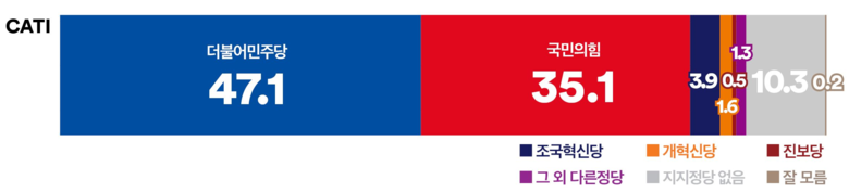 권역별로 살펴보면, ‘더불어민주당’은 호남권에서 71.5%의 압도적인 지지를 얻었으며, 서울(47.4%), 경인권 (50.7%), 충청권(44.2%)과 강원·제주(48.9%)에서도 ‘국민의힘’을 앞섰다. 반면, ‘국민의힘’은 대구·경북에서 57.4%의 지지를 얻으며 강세를 보였다.