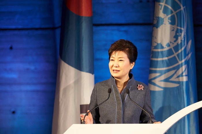 | △ 한-체코 수교 25주년을 계기로 체코 프라하를 방문 중인 박근혜 대통령이 2일(현지시간) "글로벌 금융위기 이후 세계 경제의 환경 변화에 맞춰 한국과 체코는 협력다변화를 통해 무역과 투자를 확대해야한다"고 밝혔다. 사진은 파리 유네스코에서 특별연설 중인 박 대통령. <사진출처=청와대> |