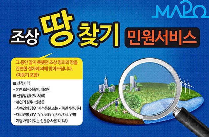 마포구는 매년 ‘조상 땅 찾아주기 행정서비스’ 신청 늘어나고 있는 이유가 혹시 자신이 모르는 조상 땅이 있지 않을까 하는 기대감과 이 서비스를 신청한 사람들 중 뜻밖에 행운을 얻은 후손들이 많다는 뉴스를 접했기 때문이라고 분석했다.