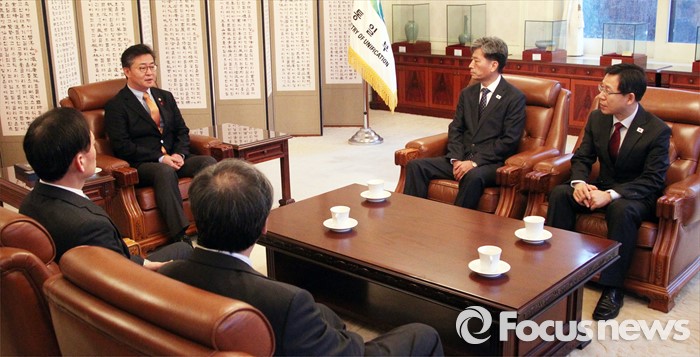 | △ 11일 오전 서울 종로구 남북회담본부에서 홍용표(왼쪽 두번째) 통일부 장관이 남북당국회담 대표단을 격려하고 있다. <ㅅ진제공=포커스뉴스> |