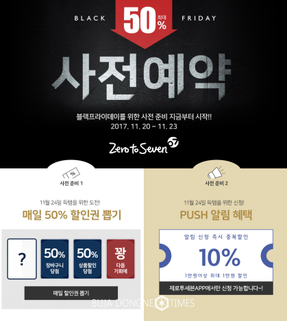 한편 제로투세븐은 블랙프라이데이 할인전을 앞두고, 20일부터 23일까지 나흘간 ‘사전예약’ 이벤트를 연다. 사전예약 이벤트 기간 중에는 매일 1인 1회씩 도전할 수 있는 ‘매일 할인권 뽑기’ 행사를 진행한다. 뽑기를 통해 당첨자에게는 24일 블랙프라이데이 당일에 사용할 수 있는 50% 장바구니 할인권과 50% 상품할인권 등을 랜덤으로 제공한다. 또 사전예약 기간 중 제로투세븐닷컴 모바일 앱에서 푸쉬(PUSH)알림 신청을 하는 고객을 대상으로 중복할인이 가능한 10% 할인쿠폰을 증정한다.