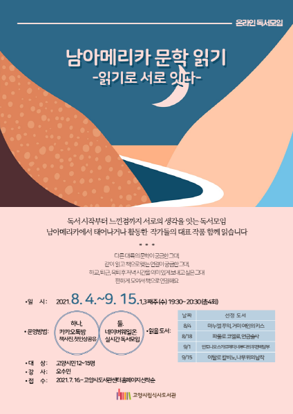 문학창작학 석사 오수민이 진행을 맡으며, 고양시민 12~15명을 대상으로 실시한다. 신청은 오는 7월 16일 오전 10시부터 고양시 도서관센터 홈페이지에서 할 수 있다.