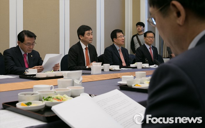 | △ 이종걸 새정치민주연합 원내대표 주재로 7일 오전 서울 여의도 국회 귀빈식당에서 안전과 인권보장 위한 대테러대책 태스크포스(TF) 2차 회의가 진행되고 있다. 오른쪽부터 문병호 정보위 야당 위원, 신경민 정보위 야당 간사, 이 원내대표, 심재권 외통위 야당 간사. <사진제공=포커스뉴스> |